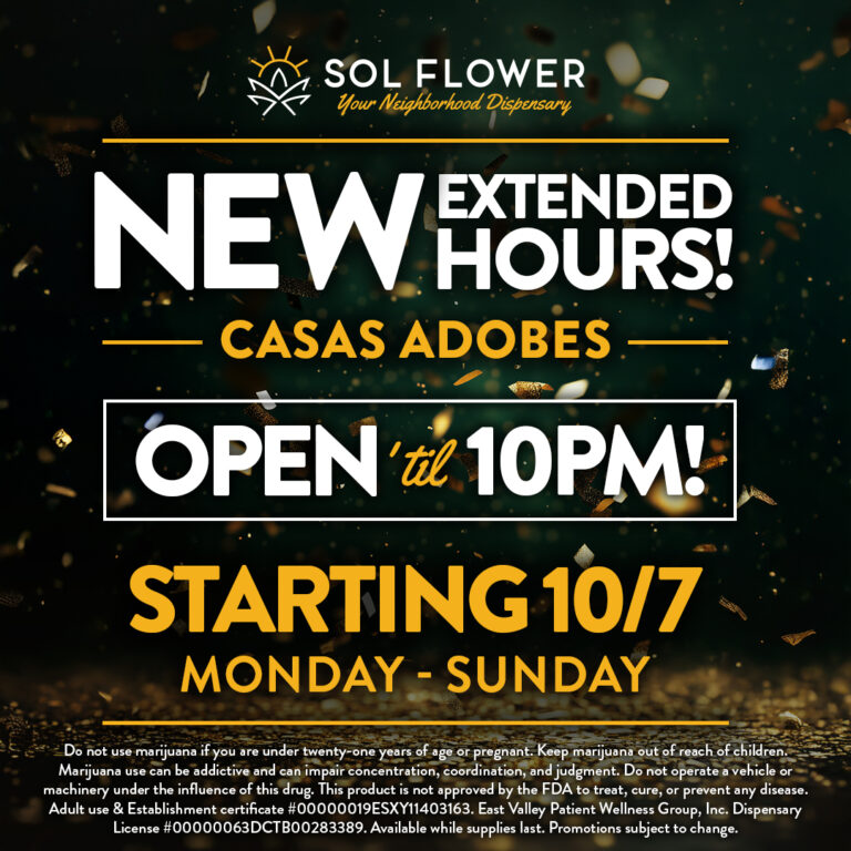 Searching for a premium-quality cannabis dispensary operated by a trusted and beloved name in the cannabis community? Sol Flower Casas Adobes is here for you! Our Casas Adobes recreational cannabis dispensary is a safe and welcoming place to socialize with fellow cannabis lovers and educate oneself about the many impactful facets of cannabis. We also invite you to explore our Sol Star loyalty program, with rotating deals on favorite brands like Jukebox, ABSTRAKT, Select, and more.