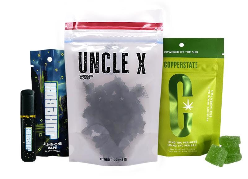 Uncle X 1/2oz Most Wanted x 1 Jukebox 1gram AIO x 1 Copperstate 100mg Edible x 1