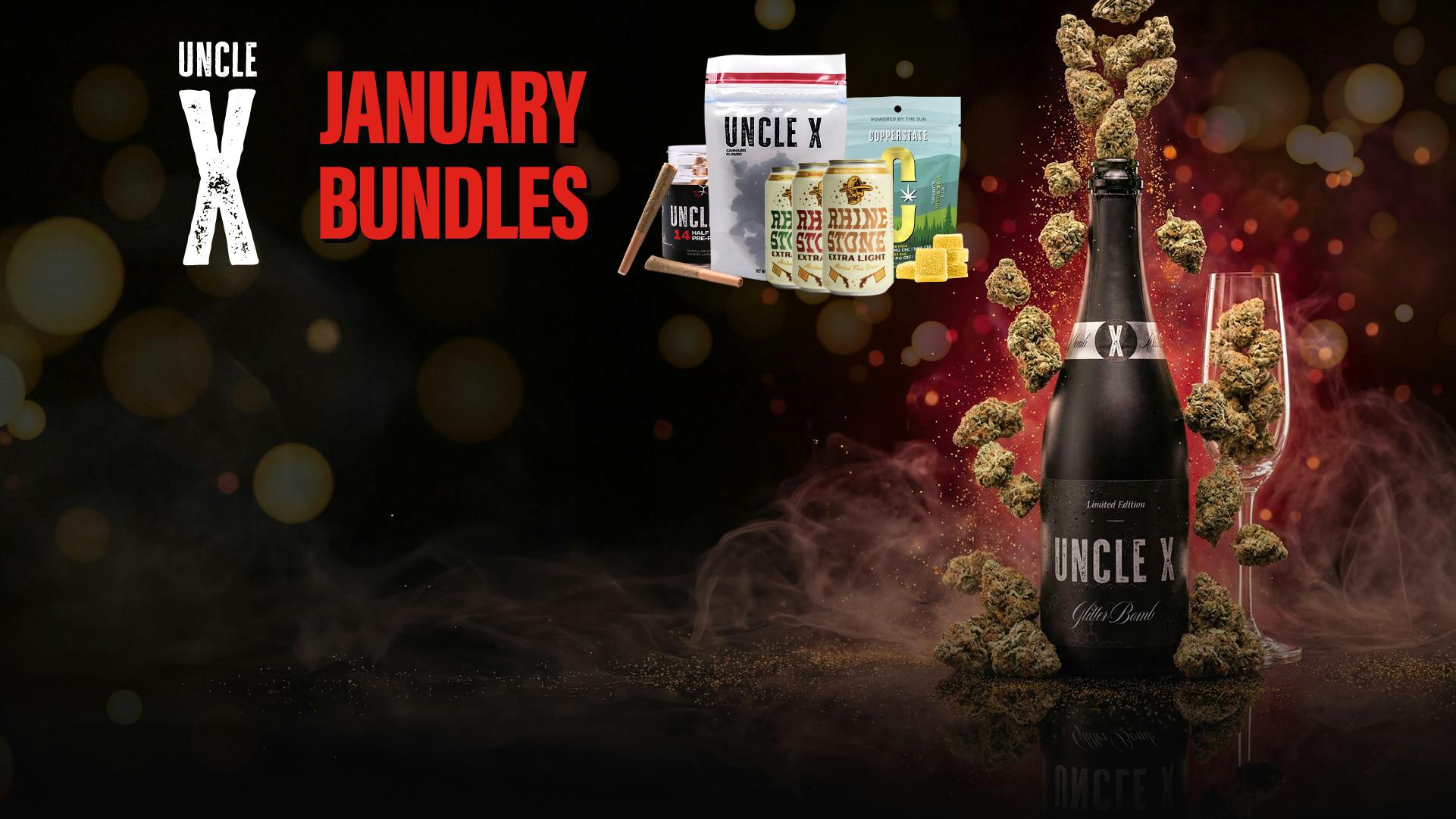 (1) Uncle X Most Wanted 1/2oz, (1) Copperstate 100mg Edible, (1) Uncle X 7g Preroll Pack, (3) Rhinestone N/A Beers.