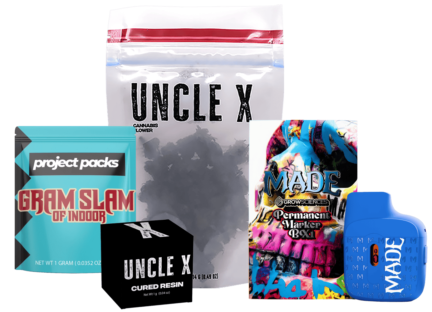 (1) Uncle X 1/2oz, (1) Uncle X / Jukebox 1g concentrate (1) Made X Grow Sciences Live Resin AIO (1) Noir Nights 1g FlowerExcludes Most Wanted