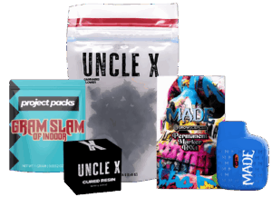 (1) Uncle X 1/2oz, (1) Uncle X / Jukebox 1g concentrate (1) Made X Grow Sciences Live Resin AIO (1) Noir Nights 1g FlowerExcludes Most Wanted